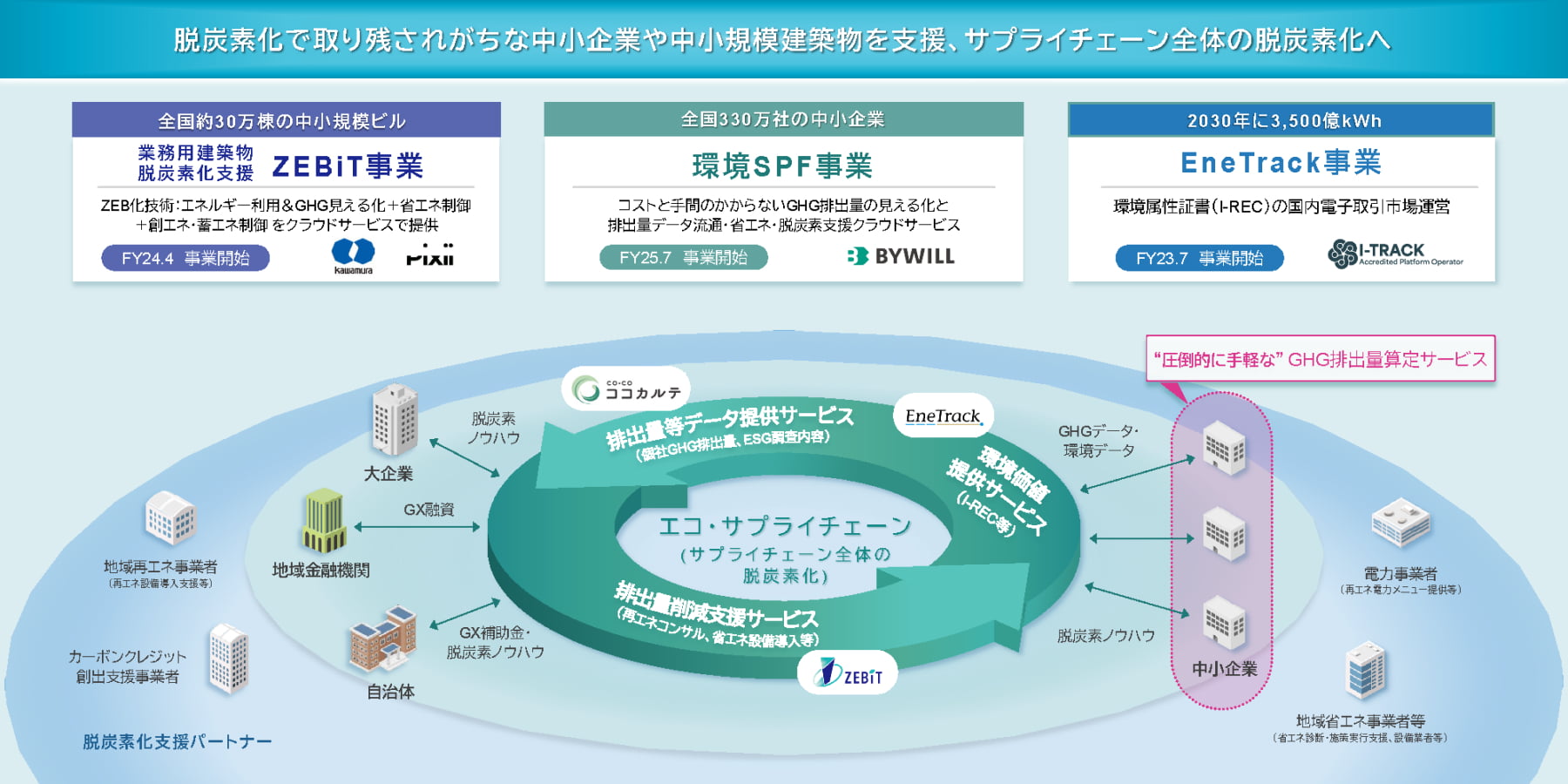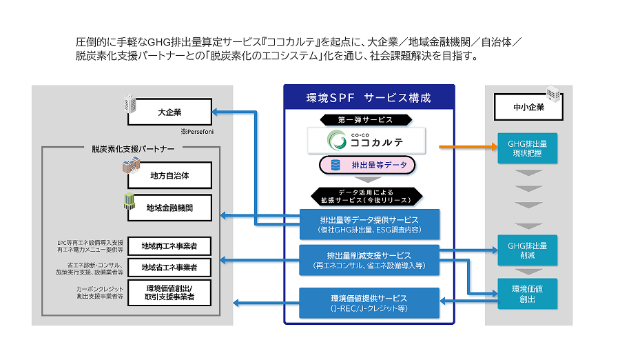 これらのうち環境SPF事業は、中小企業の脱炭素対応を支援するために構想された「エコシステム型プラットフォーム」である。算定と共有から削減・価値化までを通じて、サプライチェーン全体のGXを加速させるサービスの実現を目指している。