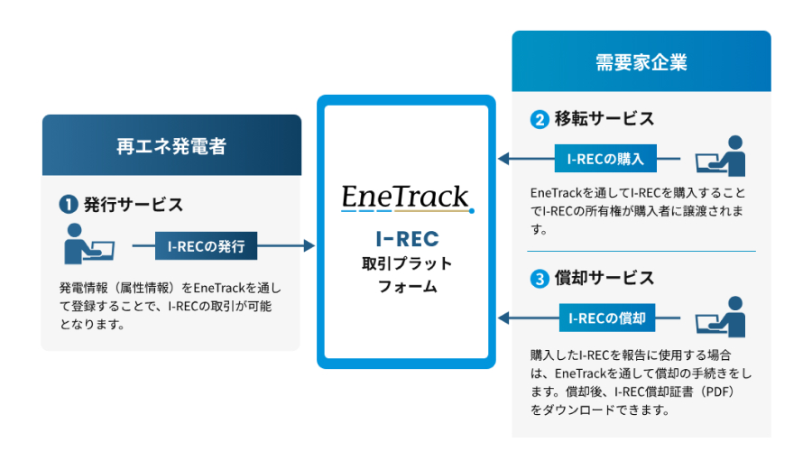 2番目の「EneTrack」は、エネルギーの属性を証明する国際規格であるI-REC(国際再生可能エネルギー証書)のオンラインプラットフォームサービスで、2023年7月に事業を開始した。主に2つの機能を提供する。1つは、Web上でI-RECの発行手続きを行うことができる「オンライン手続きサービス」。もう1つは、発行されたI-RECの売り手と買い手をつなぐ「マーケットプレイス」の運営である。