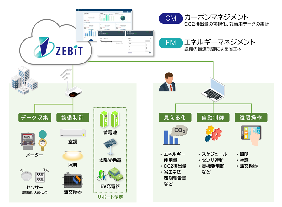 3番目の「ZEBiT」は、建物におけるエネルギー使用量およびCO₂排出量の可視化と設備制御による省エネを可能にするクラウドサービスで、2024年4月にサービスを開始した。大型ビルに導入されるようなBAS(ビルディングオートメーションシステム)やBEMS(ビル・エネルギー管理システム)のような高コストなビル管理システムを導入するほどではない中小規模の建築物においても、CO₂排出量の可視化や設備制御を実現できる。大きな設備変更を必要とせず簡単に導入できるのが特長で、脱炭素化対策が遅れがちな既築建築物の脱炭素化を後押しする。