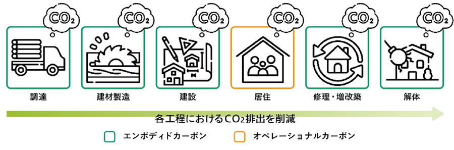 世界で建設分野におけるCO2排出量は全産業の約4割を占めており、脱炭素化が急務となっている。これまで、建築物のCO2排出量削減は、建設後に冷暖房などの運用段階で生じる“オペレーショナルカーボン(Operational Carbon)”を中心とした省エネルギー対策が先行していた。現在、資材の調達、製造から建設、解体・廃棄に至るまでのライフサイクル全体で排出される“エンボディドカーボン(Embodied Carbon)”の削減が注目されている。