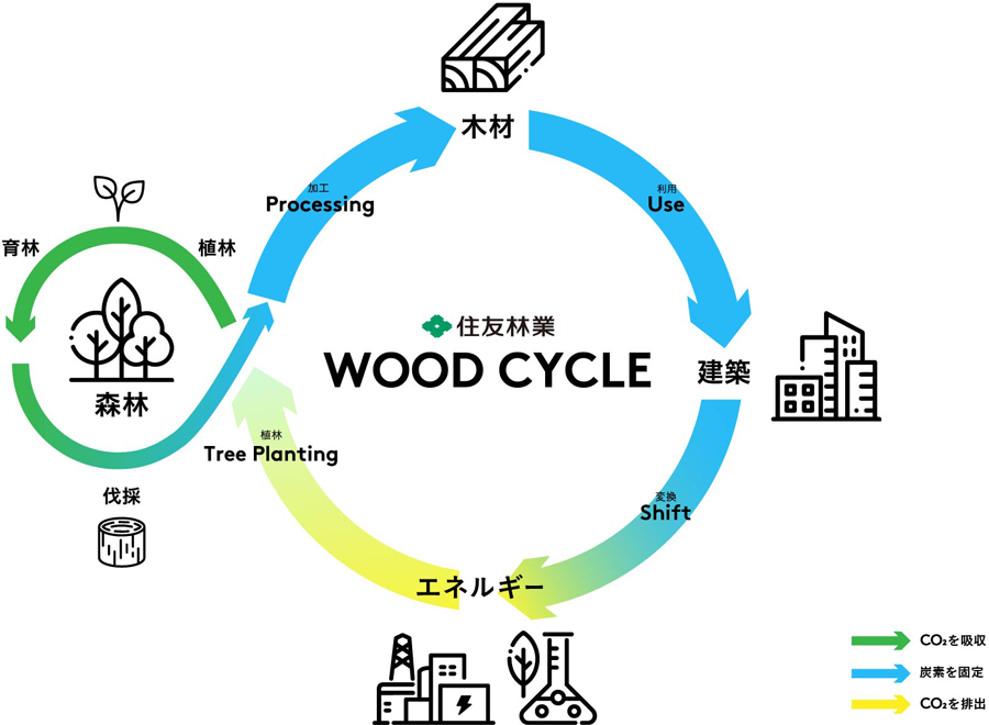 住友林業グループは、長期ビジョン「Mission TREEING 2030」の中で「ウッドサイクル」を掲げ、森林経営から木材の製造・流通、木造建築、バイオマス発電まで「木」を軸に事業活動を展開している。森林のCO2吸収量を増やし、木材製品や木造建築で長期間にわたり炭素を固定することで脱炭素社会に貢献する狙いだ。