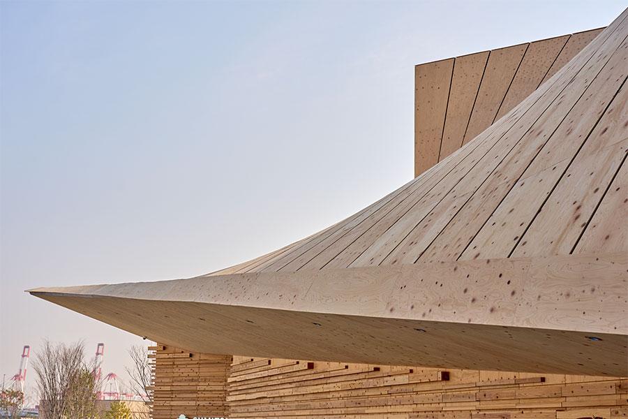 A distinctive feature of the architectural design is the roof, which forms a curved surface using a series of straight lines. Inspired by the Besshi Ridge in Shikoku—the site of the copper mines that figured prominently in Sumitomo’s development—the design evokes the silhouette of a mountain range. Many of the Sumitomo Group’s businesses originated from the Besshi Copper Mines, which operated for approximately 300 years. The Besshi Mountains, where afforestation was carried out over 100 years to restore greenery after the devastation caused by mining, are of special significance to the Sumitomo Group. By representing the Besshi Ridge, the Sumitomo Pavilion also embodies the group’s business philosophy—“Benefit self and benefit others, private and public interests are one and the same”—reflecting a commitment to consider not only one’s own interests but also those of the environment and the public.