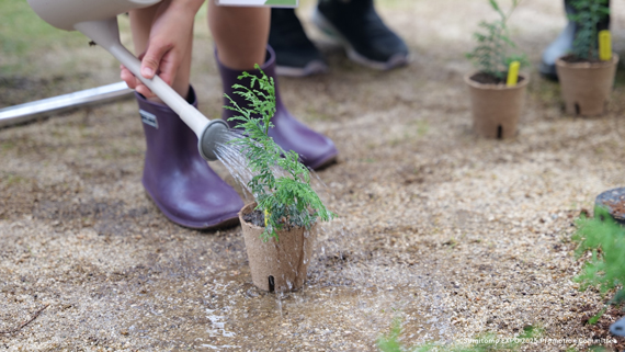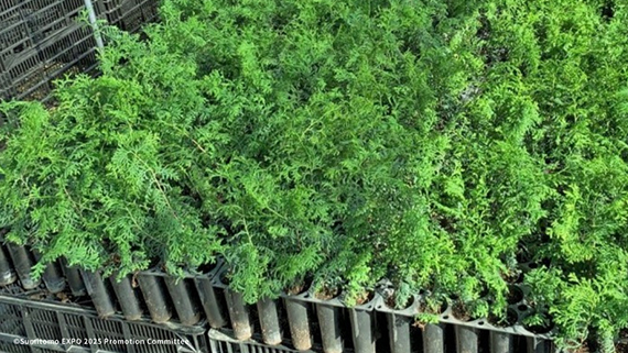 At the Expo’s Sumitomo Pavilion, visitors could take part in the “Plant a Tree” program, allowing them to contribute to the creation of a forest for the future. The Japanese cypress seedlings planted by the children were set in the area where timber had been harvested to build the pavilion. They will eventually grow into a thriving forest to be passed down to future generations. How this “Forest of Life” will look decades or even centuries from now remains to be seen. This section reports on the growth of these saplings.