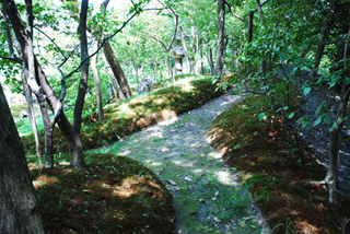流れを越えて築山へ進むと、アカマツの群植と低木のモチツツジが迎え入れてくれる。庭園から望める東山は、かつてアカマツ林が広がっていたとされ、その遠景と渾然一体となった景色を作り上げている。木立の間を縫うように進むと、虫や鳥の声はいっそう大きくなり、木々と土に醸された香りが、鼻孔をくすぐる。上り下りを繰り返す苑路は、里山を歩くようで、ときに分かれ道に立つと、迷わぬようにと感覚が呼び覚まされていくのを感じることができる。